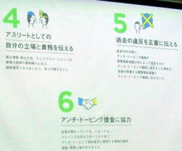 スポーツに参加するという条件として、6つの役割と責務があると言われています。ルールを理解してどこでも検査に対応する。検査に正確に正直に伝える。捜査に協力するというようなことが言われています。 |
