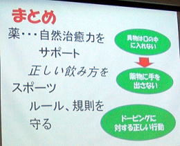 異物は口の中に入れない、ということを薬教育で学べば、薬物1つも手を出さないでしょう。スポーツはルール、規則を守るという、そこが育っていればドーピングに対する正しい行動ができるのではないかと思っています。 |