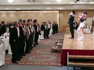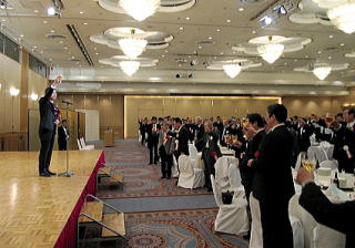 総会後の懇親会には、来賓、各部のOB・OG、部長、副部長、監督ら421名が集まりました。森田恒雄副会長の開会の辞で始まり、校歌斉唱のあと、物故者に黙祷を捧げました。