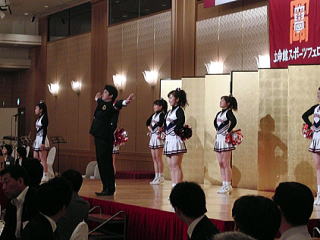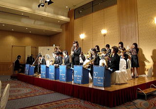 その後、森島朋三 学校法人立命館専務理事による「立命館人を励まし感動を与えているのはスポーツです。是非試合に勝って来年さらに盛り上がっていただきたい。」旨の乾杯により歓談に入り、アトラクションとして参加いただいた「立命館Jazz Club(Σ Spirits Jazz Society ツイッター)」 の皆様の生演奏が歓談を盛り上げ、そして応援団の皆様による演舞演奏と、そのリードにより参加者全員が応援歌「グレーター立命」を合唱しました。