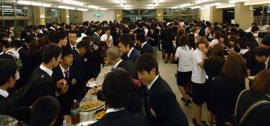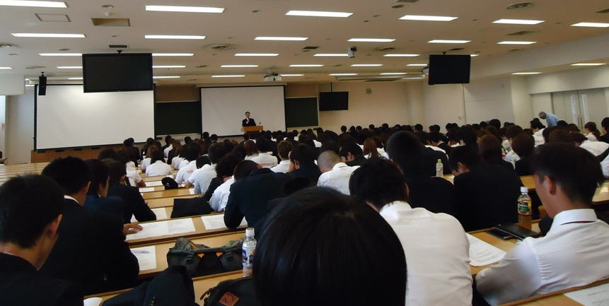 前に立っていると非常によく顔が見えるというか、みんなが何をしているかということがよく見えます。どこにどの部が座っているかよく見えきます。みなさん1回生ですが、その部を背負って来ているわけで、今年の○○部の1回生はマナーが悪いとか、全員シャキッとしているなとか、皆さんの立ち振る舞いがそれすなわちその部の評判と直結していきます。 先程林副会長から、4つの事についてお話しがありましたが、何人の者がメモをとって自分のものにしようしたか。そういう前向きな姿勢があったのか。メモをとる者もいない、すでに寝ようとしてる者がいる、携帯さわっている者もいる、そういう状況が体育会の1回生としてふさわしいのかどうかというのをしっかり考えていただいて、2時間半長丁場になると思うのですが、眠くなるかもしれませんが、しっかりメモをとるように。2時間半有意義なものになるようにしてください。 |