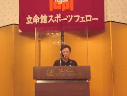 続いて、学校法人立命館理事長・森島朋三様及び同総長・仲谷善雄様からご挨拶をいただき、立命館スポーツフェローからお二人に花束が贈呈されました。