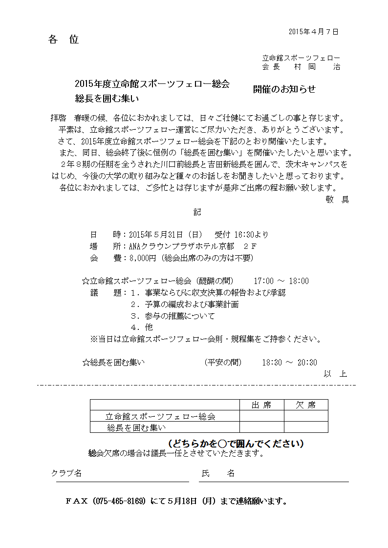 | 立命館スポーツフェロー総会・懇親会開催の知らせ(PDF) |