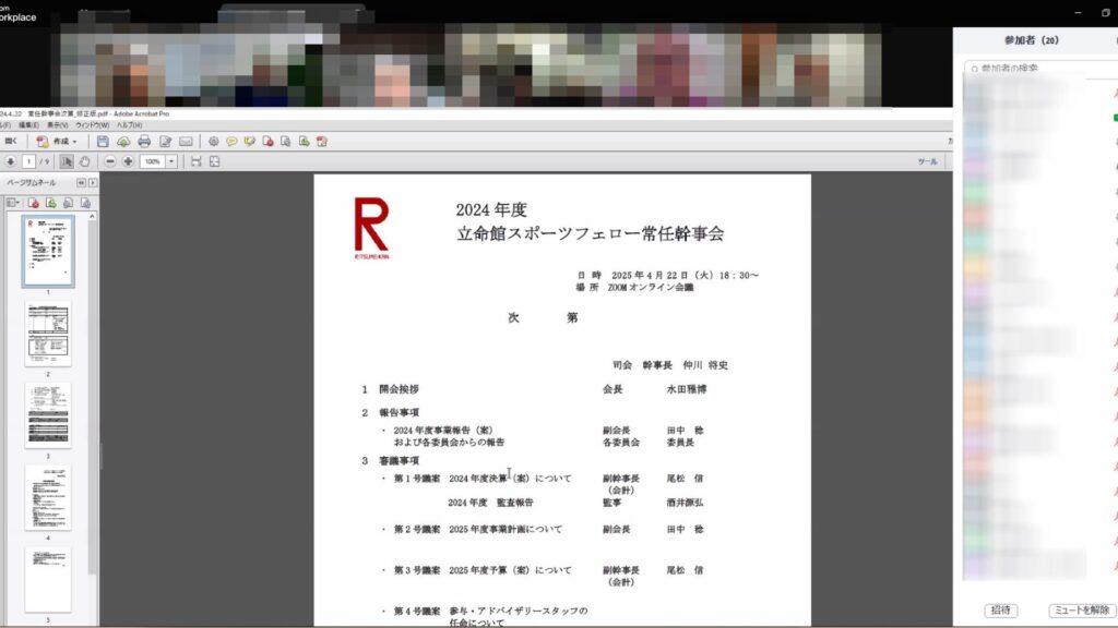 常任幹事会は、幹事長が招集し、会長、副会長、幹事長、副幹事長、常任幹事で構成して、立命館スポーツフェローのすべての事項を審議・実行するとともに、意思疎通を図っています。コロナ禍以降は「ZOOm」によるオンライン会議が定着しています。